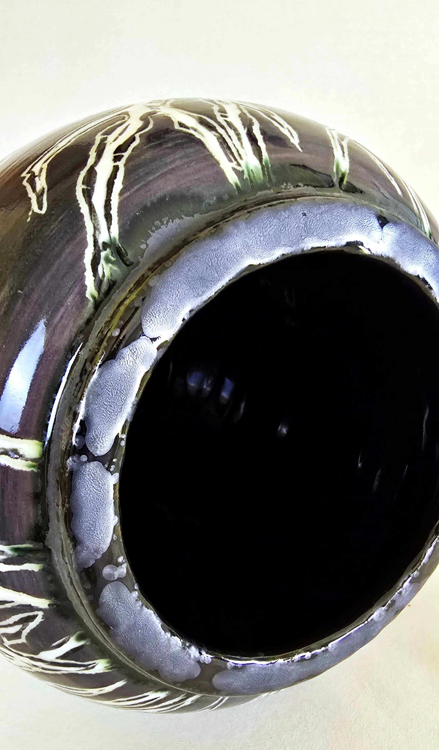 The exterior showcases layers of underglaze, carved to reveal dynamic white linework against a dark ground, then finished with a clear glaze for depth and subtle sheen. This piece reflects both strength and refinement—perfect as a display vessel or standalone sculptural accent.